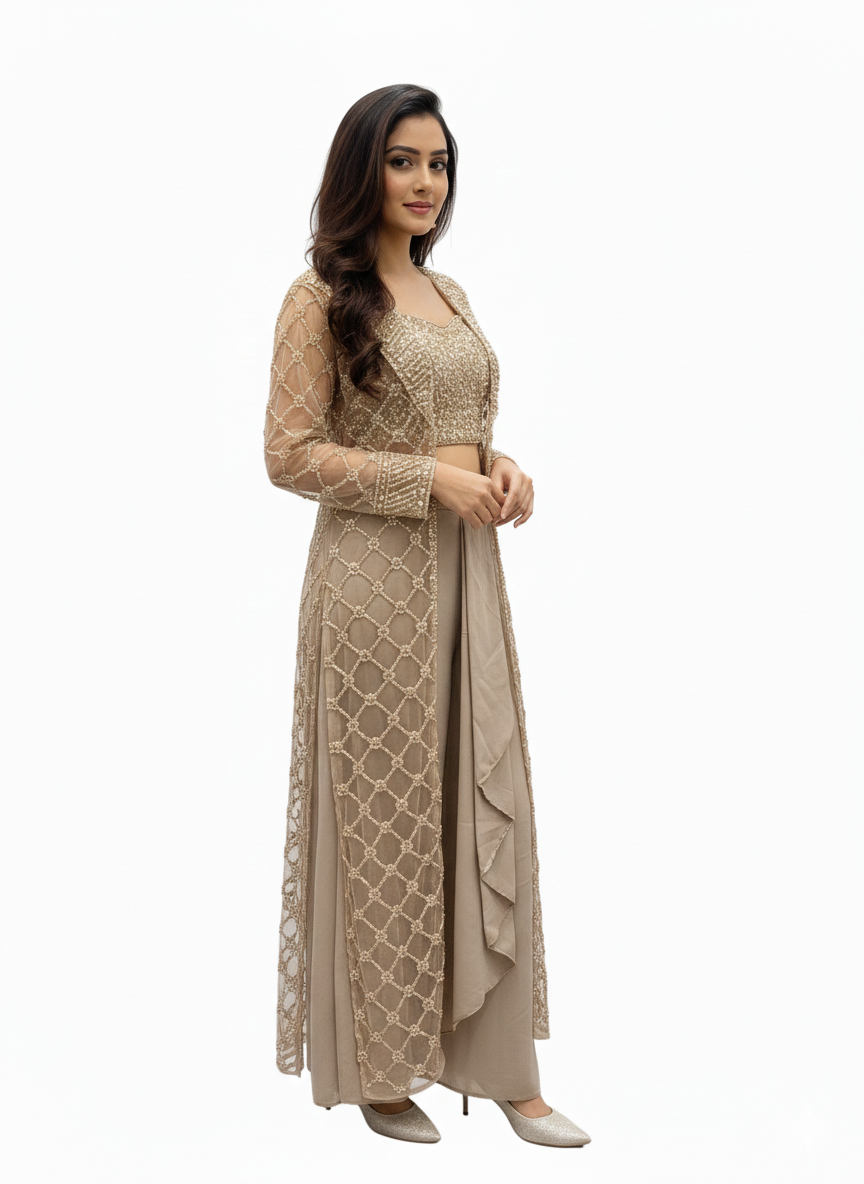 Make a bold and elegant statement with this stunning Champagne Gold Indo Western Long Jacket Dress. Designed for modern women who love a fusion of traditional and contemporary style, this outfit blends glamour with sophistication.
