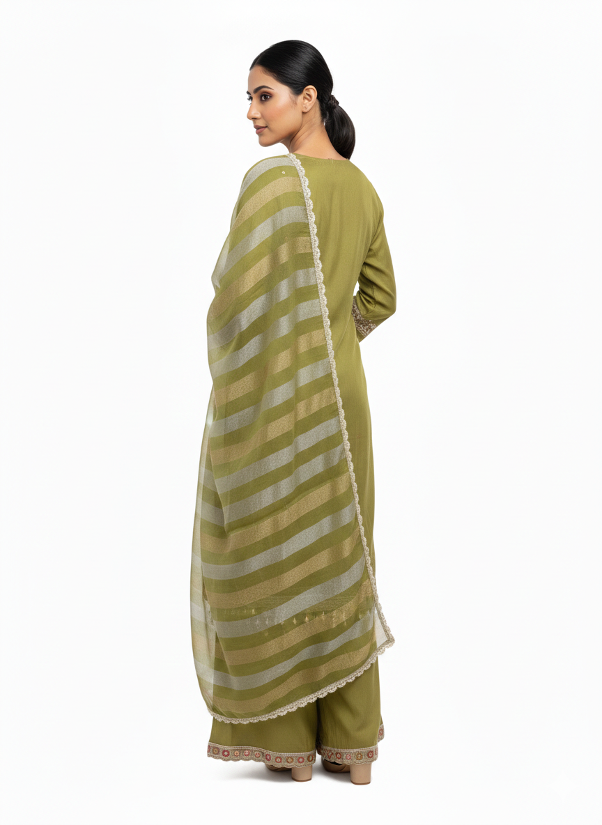The straight-cut kurta is paired with a comfortable matching palazzo and a soft striped dupatta with delicate lace borders, adding grace and charm to the overall look. The subtle olive green shade makes it ideal for festive celebrations, family gatherings, cultural events, and special occasions.